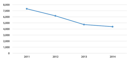 Even with more than 4000 donors, only 7% of AGU members supported AGU with charitable gifts in 2014. What’s more telling is that the number of donors has fallen at a significant rate since 2011, when there were nearly 7500 donors (see Figure 2).