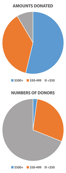 Last year, our Voluntary Contribution Campaign raised nearly $400,000 to support programs and initiatives across AGU. A look at who contributed shows that AGU has a very strong base of donors. Those supporting AGU with gifts of $500 or more made up just over 2% of donors and contributed a total of nearly $200,000 (see Figure 1). Just 37 donors made gifts of $1000 or more in 2014, equating to 1 out of roughly every 1600 AGU members. Nearly 69% of our 4400 donors gave less than $50, totaling almost $32,000.