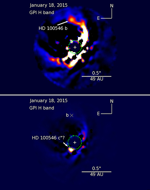 One of the teams, led by Thayne Currie of the Subaru Telescope in Hawaii, an instrument of the National Astronomical Observatory of Japan, examined candidate planets circling the young star HD 100546, about 320 light-years from Earth. Currie and his colleagues used the Gemini Planet Imager, an instrument that takes the twinkle out of starlight—the blurring caused by Earth’s turbulent atmosphere—to confirm the existence of one planet and find tentative evidence of another. They reported their findings in the 1 December issue of Astrophysical Journal Letters and also described their results on Tuesday at a conference on exoplanets in Hawaii.