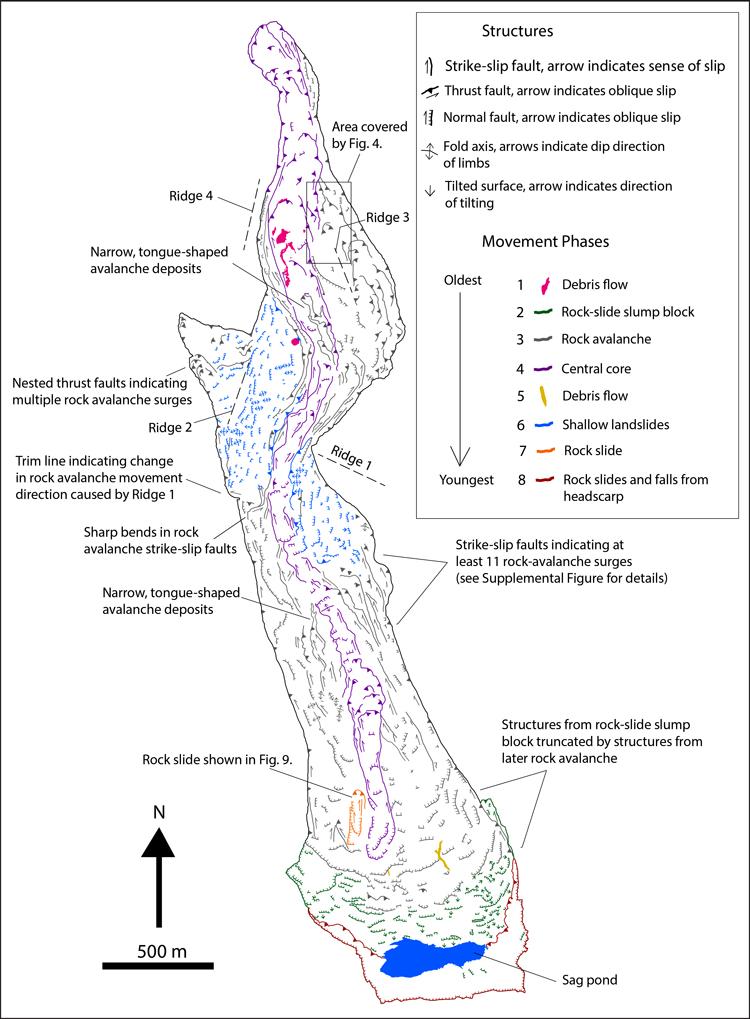 After this mass settled, eyewitnesses searching for the missing men say that its core along the valley bottom continued to flow. Sure enough, the researchers found mini strike-slip faults within the flow, confirming that its middle kept moving even though edges stayed stationary. Another debris flow topped off the tumultuous events.