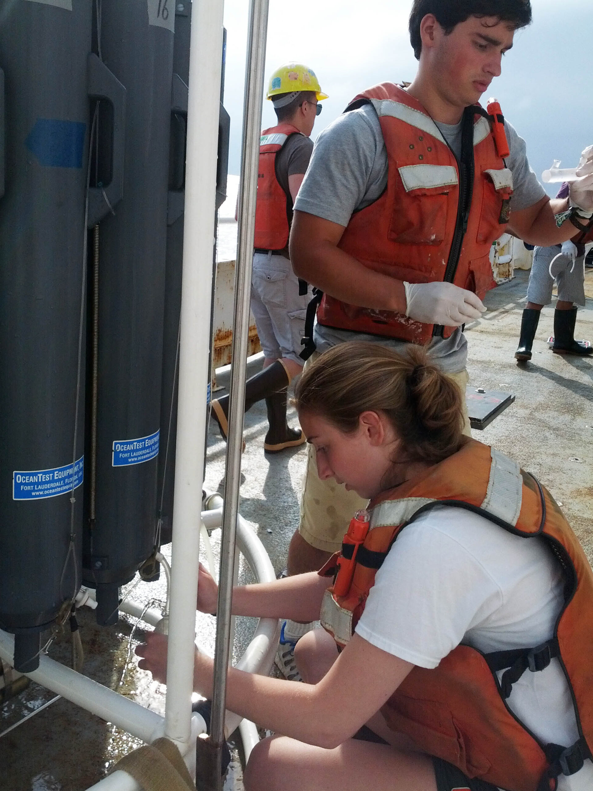In July of 2014, Kessler led a research cruise to Hudson Canyon to track the fate of the methane. Ruppel and Thomas Weber of the University of New Hampshire in Durham pinpointed the seeps using sound waves that bounced off methane bubbles. The team sailed the National Science Foundation’s research ship R/V Endeavor over the seep field, along a 6-kilometer (3.7-mile) stretch of the canyon, and collected water samples at varying depths using sensors that simultaneously measure conductivity, temperature, and depth of ocean water, known as CTD rosettes.