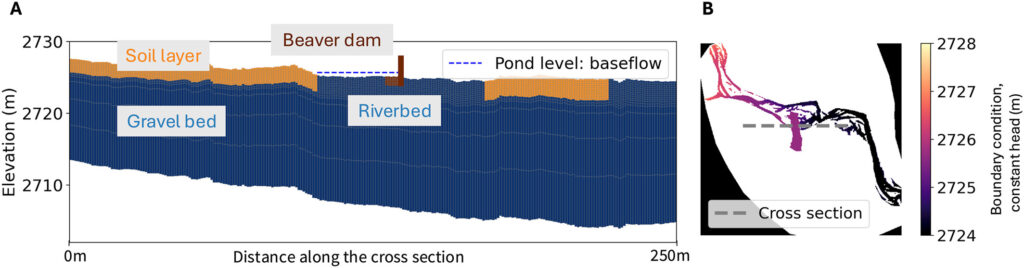 There is a consensus that beaver dams with associated ponding and floodplain inundation have a strong influence on ambient hydrologic and hydrogeologic conditions in mountainous alluvial valleys. However, very little quantitative information is available that sheds light on the impact on groundwater recharge and flow patterns.