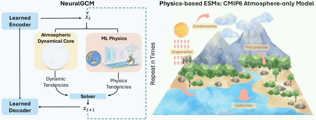 Chen et al. [2026] perform a series of tests that cover systems at the synoptic scale, interannual scale, and under long-term out-of-distribution forcings. This study uses a hybrid model called NeuralGCM, which combines traditional Earth system modeling with ML approaches. For a set of idealized experiments, NeuralGCM produces performs similarly to conventional physics-based Earth system models. However, some limitations were found in simulating extratropical cyclone strength, atmospheric wave responses, and stratospheric warming and circulation responses. In general, the combination of ML with established physics-based modeling represents a promising path forward in achieving weather and climate analyses that require less computing time.