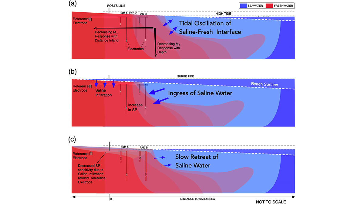 Saltwater intrusion poses a growing threat to freshwater supplies in coastal regions, yet detecting its early movement remains difficult. In a new field study from a United Kingdom beach sand aquifer, Rowan et al. [2026] demonstrate that ocean tides leave a measurable electrical signature in the subsurface—one that may help track saline intrusion before it reaches water supply wells.