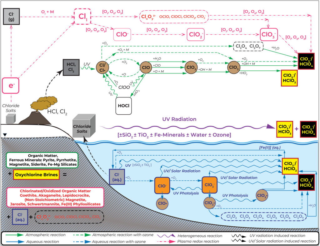 Furthermore, chlorates are effective iron oxidants under Mars-relevant conditions and likely contribute to the formation of the planet’s ubiquitous ferric minerals. Additionally, as potent freezing point depressants, these salts may stabilize transient liquid brines even in modern equatorial regions. As a halogen-rich planet, Mars hosts a reactive surface chemistry where oxychlorine species play a substantially more dominant role than they do on Earth.