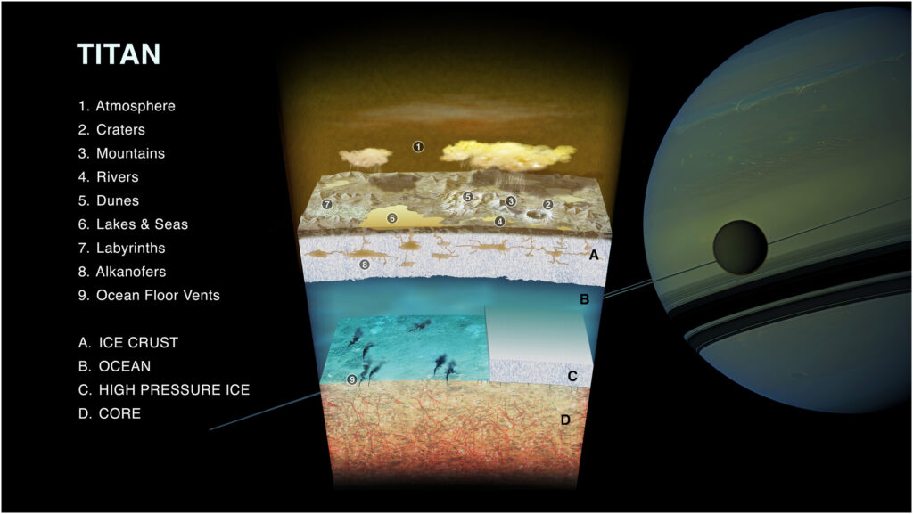 Titan is really unique. It’s the only moon in our solar system with a significant atmosphere, and we still don’t know for sure why that is, although there are theories of course, such as outgassing and even impacts. That alone makes it an enigma. In addition, its atmosphere hosts a ‘hydrological’ cycle with rivers, seas, evaporation, cloud formation and rainfall, but based on methane rather than water as on Earth. Finally, if all that isn’t enough, it has really fascinating chemistry that may be creating the building blocks for exotic forms of life. So, there’s a lot of different kinds of science questions covering many fields to study and solve.