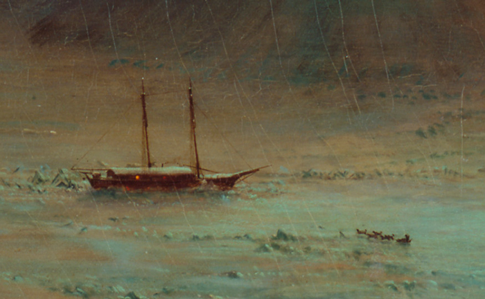 Aurora Borealis is thick with symbolism. The auroral arc of light encompasses a dark void in the sky that might represent the uncharted north or some greater unknown. Below this, and at the foot of dark mountains, Church depicts humanity—the forlorn man with his sled dogs—as tiny and seemingly insignificant (see detail). The challenge of exploring the unknown is represented by the placement of the schooner: locked in the ice, facing a vast frozen sea. Its crew might be in search of the Northwest Passage or the mythical ice-free polar sea [Hayes, 1867]. They may or may not succeed in their search; regardless, the universe will carry on. Still, despite seemingly overwhelming challenges, there is a small sign of optimism: light shines through a window on the ship.