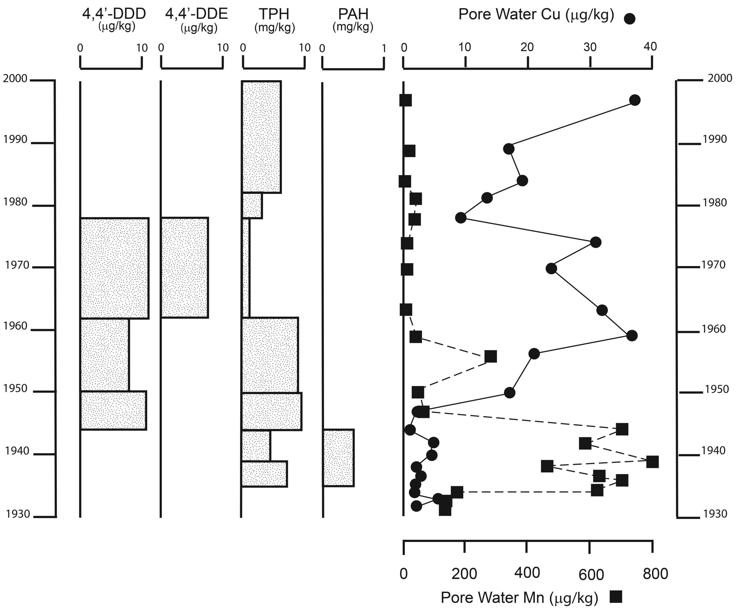 ![Fig. 2. Chronostratigraphic plot of contaminant stratigraphy in a core from the Ballville Reservoir (Sandusky River, Ohio). The plot shows that DDT derivatives are found in a horizon corresponding to agricultural use in the drainage basin, whereas total petroleum hydrocarbons (TPH) and copper (Cu) vary throughout the core. Manganese (Mn) and polycyclic aromatic hydrocarbons (PAHs) are concentrated below the sediment redox zone. Credit: Evans and Gottgens [2007]](https://eos.org/wp-content/uploads/2015/09/15-0232_Evans_4946_F02_BW_WEB-480x395.jpg)