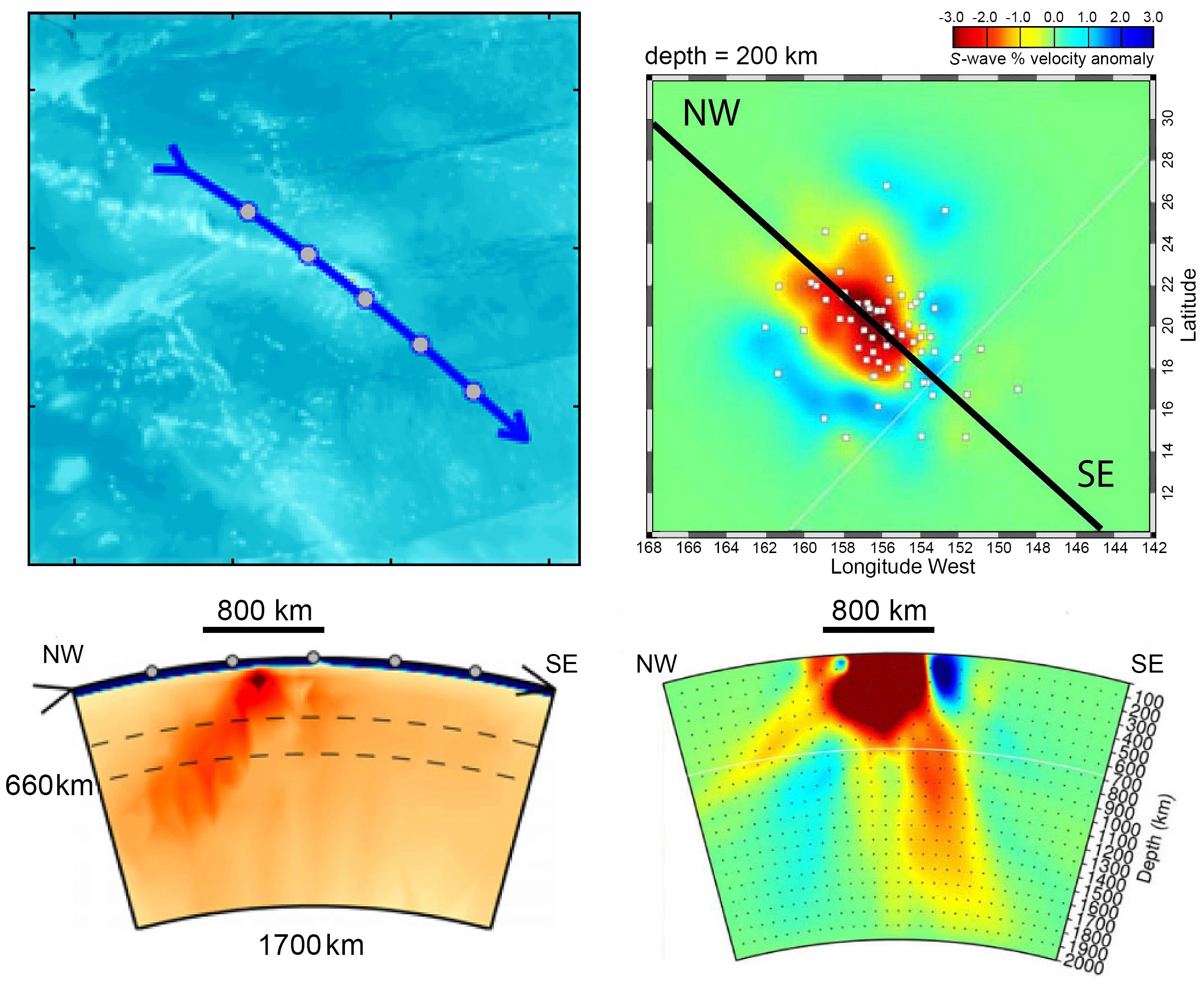 Unfortunately, Hawaii is extraordinarily poorly placed for study, with a relatively small landmass and few nearby earthquake sources. Teleseismic tomography experiments typically cannot probe deeper than the aperture of the seismometer network used. As a result, only the upper few hundred kilometers of the mantle beneath Hawaii can be reliably imaged; seismic tomography cannot reach down a few thousand kilometers, where plumes are thought to originate. Recent studies exhibit little repeatability, even at shallow depths below Hawaii (Figure 2).