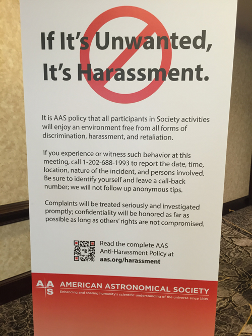 Codify a no-tolerance culture. Scientific societies have the responsibility to represent their members and the power to make a clear statement about what behaviors will not be tolerated. The American Astronomical Society has an antiharassment policy that defines sexual harassment as “unwelcome sexual advances, requests for sexual favors, and other verbal or physical conduct of a sexual nature.” Their policy outlines processes for reporting, investigating, disciplinary action, and appeals.