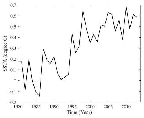 ![Fig. 2. Average sea surface temperature (SST) in the North Atlantic since 1980, relative to 1901–1970, for the ocean area bounded by 0°– 50°N and 10°W– 80°W. Computed from the Hadley Centre Global Sea Ice and Sea Surface Temperature dataset [Rayner et al., 2003]. Credit: Q. Yang](https://eos.org/wp-content/uploads/2015/08/Fig-2_embed4_Web-480x392.jpg)