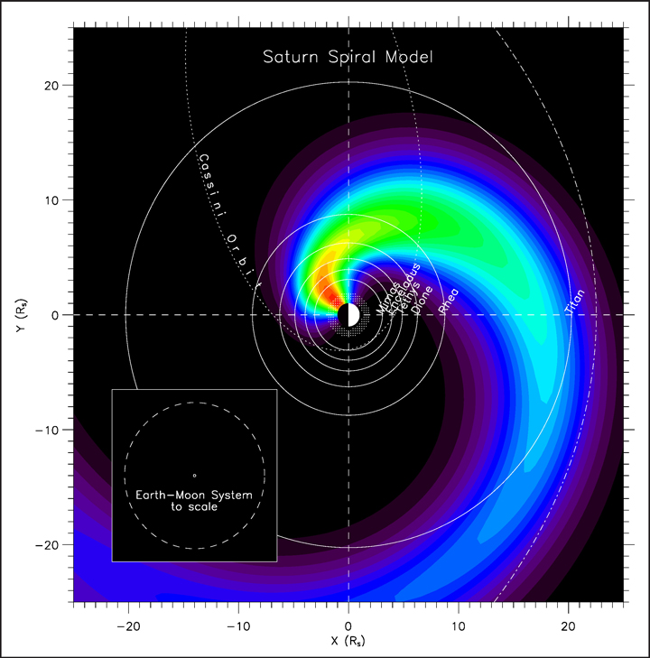 To construct the new model, Carbary used observations made by NASA’s Cassini spacecraft during the first 200 days of 2010. As it swung around Saturn—well within the magnetosphere—Cassini measured magnetic field strength and plasma density. Carbary used these data to calculate the wave speed of the hypothetical spiral.