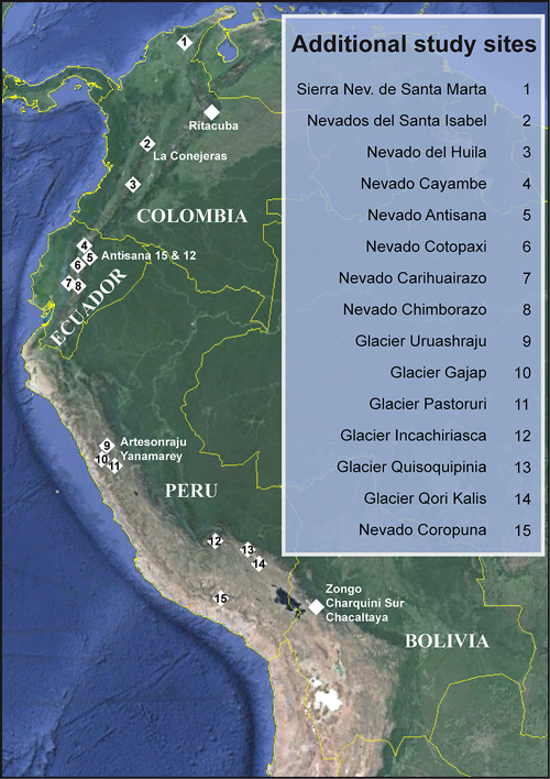 ![Fig. 1. A 1991 glacier-monitoring initiative in Bolivia has grown into a permanent network in the tropical Andes, with sites in four nations. The main study sites are marked on the map, and additional study sites are numbered and listed in the inset. Credit: Modified from Rabatel et al. [2013], CC BY 3.0](https://eos.org/wp-content/uploads/2015/10/15-0262_Sicart_4888_F01_Web.jpg)