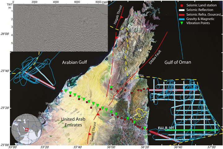 - the velocity structure of the crust and uppermost mantle beneath the orogenic belt and the flanking UAE foreland basin and Gulf of Oman rifted margin