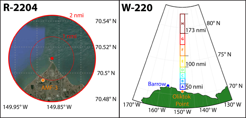 Spurred by the rapid decline in Arctic sea ice and the need to better understand the evolving Arctic atmosphere and its interactions with the surface, the DOE further worked with the FAA to develop a new block of airspace for researchers to use, extending approximately 700 nautical miles over the Beaufort Sea to the north of Oliktok Point (see Figure 1, right). This space, designated warning area W-220, is 40 nautical miles wide and divided into two altitude ranges (0–2000 feet and 2000–10,000 feet) and will provide critical access for scientists to the environment overlying the Arctic Ocean.